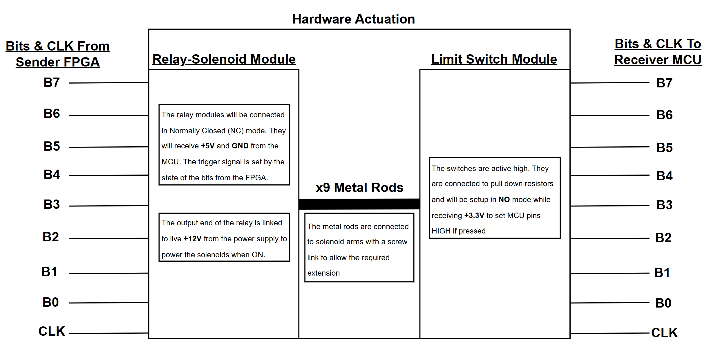 The goal of the project is to demonstrate serial data transfer through a mechanical actuation mechanism rather than traditional electrical signaling. Mechanical motion, driven by solenoids, relays, and limit switches, replaces voltage as the medium for communication across nine parallel channels, with one serving as the CLK for synchronization and eight for data bits, transmitting one byte per cycle in simplex mode. Each relay energizes a solenoid when its input is HIGH, pressing a limit switch on the receiver side to register a HIGH signal. For secure communication, the sender encrypts messages using AES-128, and the receiver decrypts the transmitted bytes to reconstruct the plaintext. Communication between sender and receiver is coordinated through a web app: the user types or uploads a message, where the ESP8266/ESP32 sends/receives a request to/from the MCU–FPGA system for encryption, transmission, decryption, and final display of the recovered message on the receiver’s web page.