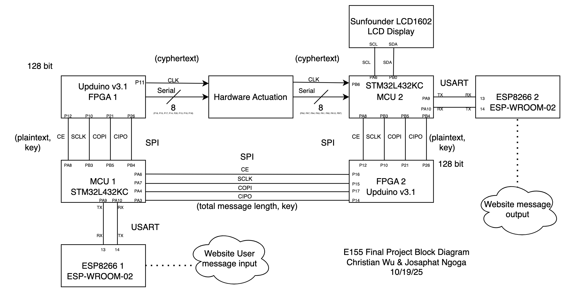 - Week of 10/27/2025: Submit purchase order. Develop and test MCU-FPGA encryption module (Josaphat) and MCU driver for ASCII encoding/decoding and web requests (Chistian).