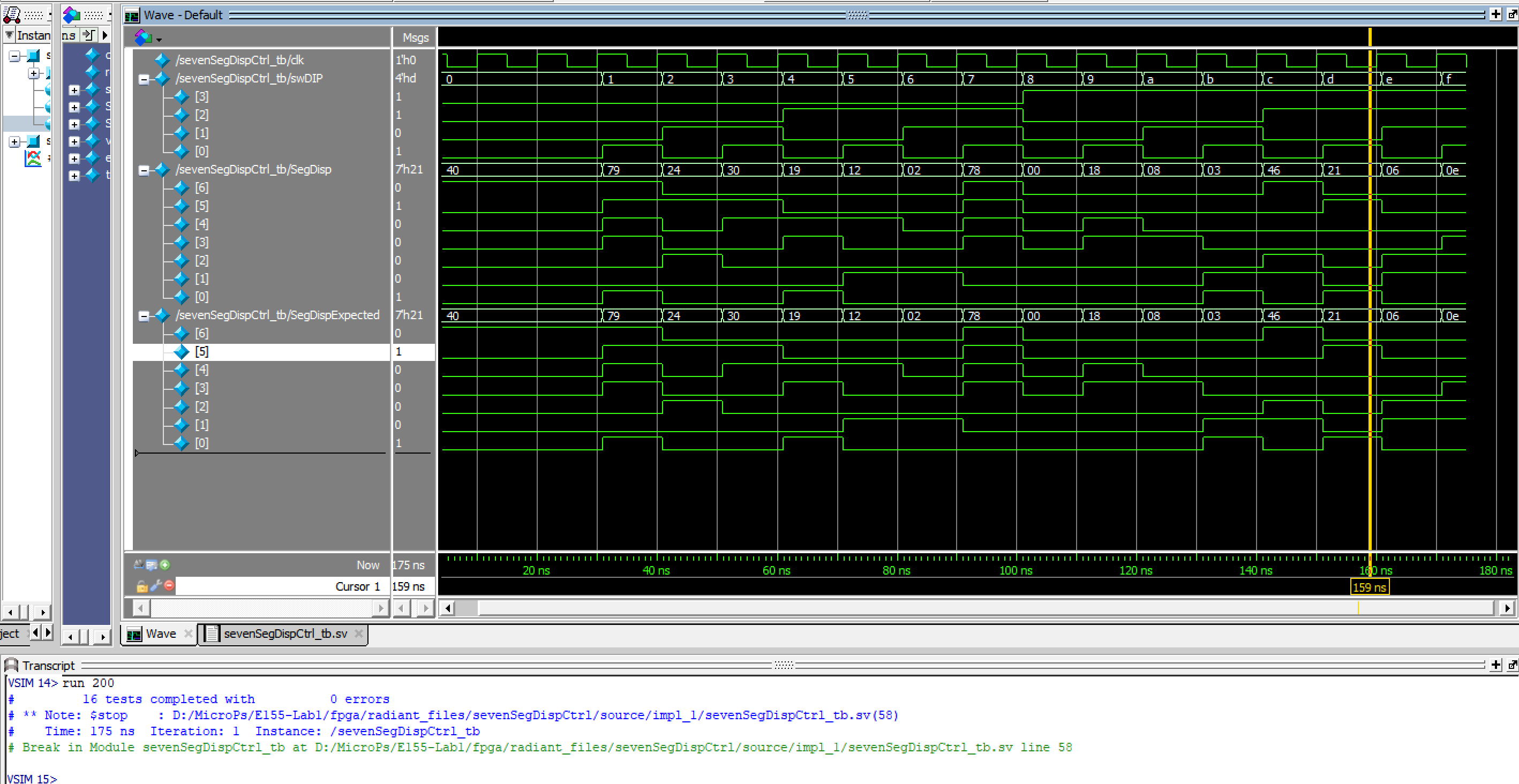 The waves in Figure 3 above show that the the two displays turn on at different times as onSeg[1] and onSeg[1] oscillate oppositely. The waves shows that sevenSegIn chooses sW1 switch input when onSeg[1] is HIGH and sW2 input when switch onSeg[0] is HIGH showing the time multiplexing logic works. The LED sum also worked properly and was verified using the assert statement, executing all with no error returned.