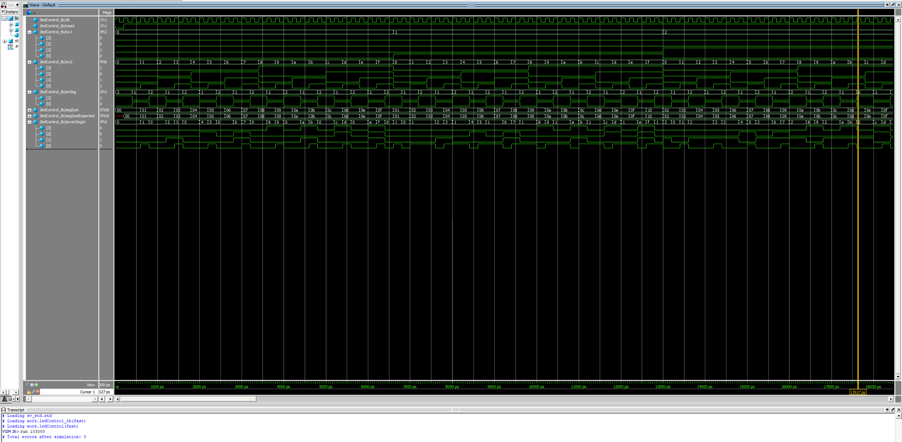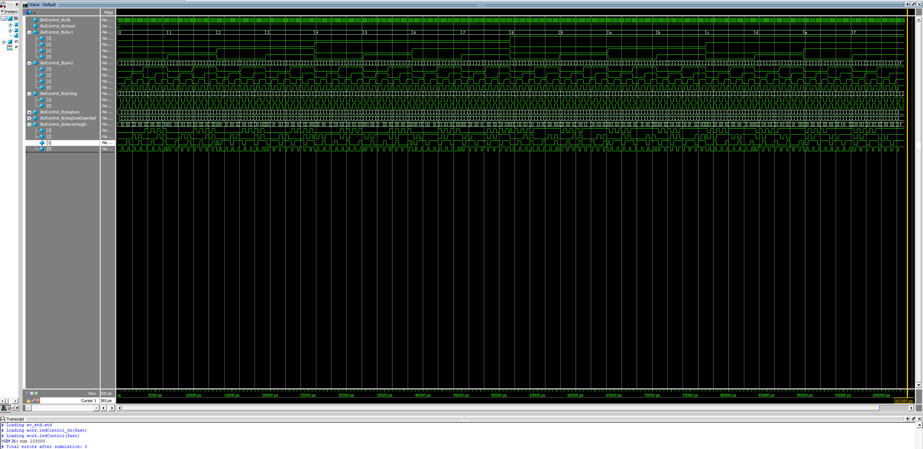 My first attempt was to create a fast clock so that counting happens so fast and could see switching. I adjusted my timescale to `timescale 1ns/1ps allowing me to create a clock with period of \(0.2ns\) (\(50GHz\)). This didn’t work as good because the simulation had to run for as long as \(200ms\) just to see a switch cycle. My final solution was to implemenet a parameter SWITCH_COUNT which allowed me to control the number of ticks outside the ledControl module. In my testbench I set SWITCH_COUNT = 1 which essentially switched enablers after 1 tick, equivalent to switching every clock cycle which solved my issue. Each module was simulated individually and running the simulation yielded the following waves: