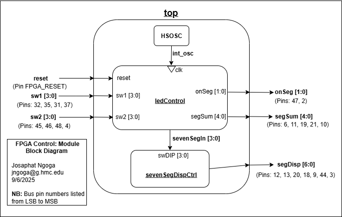The sum of the displayed numbers was calculated by simply performing binary addition of the two 4-bit switch inputs producing a 5-bit output. Each bit of the sum was relayed to a specific LED, giving us 5 different LEDs to show the binary representation of the sum. The modules to control these elements were written in SystemVerilog to run on the FPGA and to ensure proper communication and signal control, they all followed the hierachy in the block diagram below: