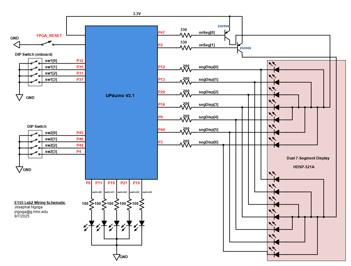 The main task for the lab was to control the provided HDSP-521A dual 7-Segment display using only 7 pins from our FPGA. The FPGA received two different switch inputs from two different switch blocks, each meant to drive a specific 7-segment display. With limited hardware, the dual 7-segment pins had to share FPGA pins to drive the respective segment displaying the hex equivalent of the switch binary input. The FPGA outputted enablers meant to choose which display has to turn on by driving the respective common anodes HIGH. Each display responded to a respective switch block. Two 2N3906 PNP transistors were used to help drive large currents to the common anodes so as to avoid excessive current draw from the FPGA. An extra task was to show the sum of the two displayed digits using LEDs. These LEDs were also driven by the I/O pins from the FPGA.