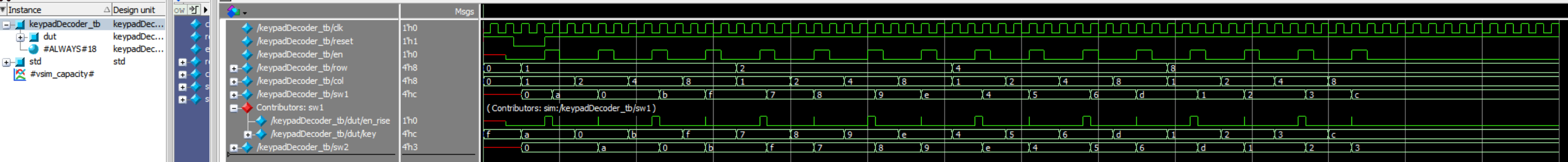 The waves in the figure above show that the decoder will properly find the corresponding key and will display the default 4'hF anytime an invalid input is received such as when more than one row/col are reported as HIGH.