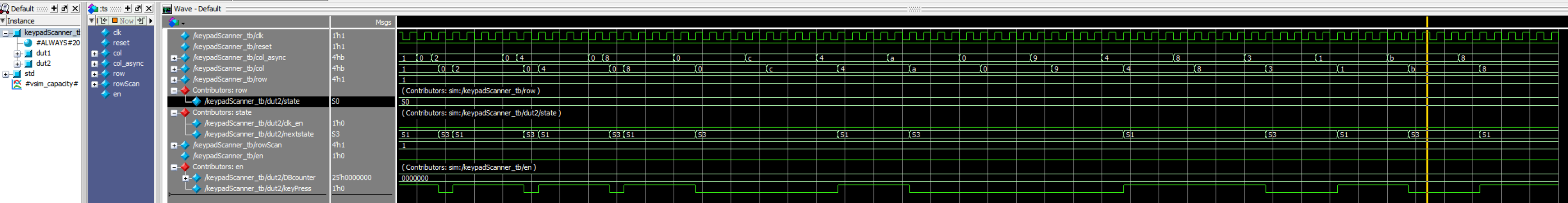 The testbenches were extremely helpful, especially for this particular lab. They helped me through my synchronization logic as I tried to ensure that all my signals are at the same clock cycles. They also helped me know how my scanning FSM was moving aroung and I noticed some issues that my FSM would set HIGH all rows before confirming a key which would display all 4 numbers in the pressed column before finaly settling on the actual number I pressed. This is where I figured out the benefit of tightening my FSM transitioning logic which fixed this issue.