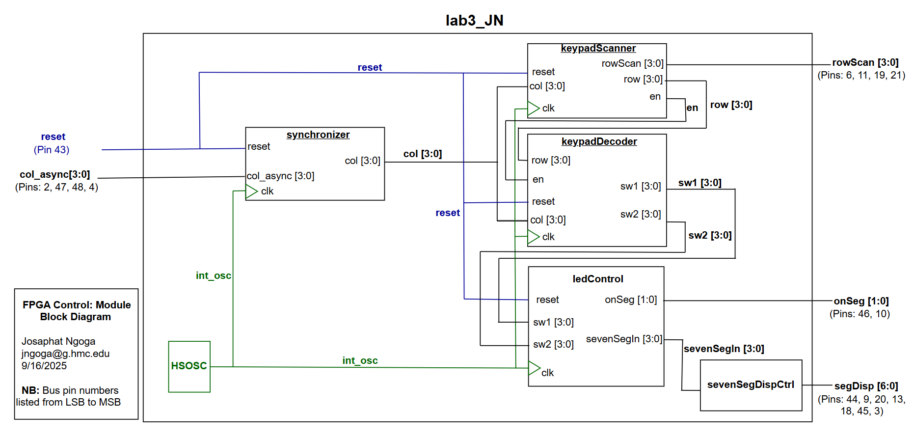 The modules to enforce the keypad logic and those that control the respective circuit elements were written in SystemVerilog to run on the FPGA. To ensure proper communication and signal control, they all followed the hierachy in the block diagram below: