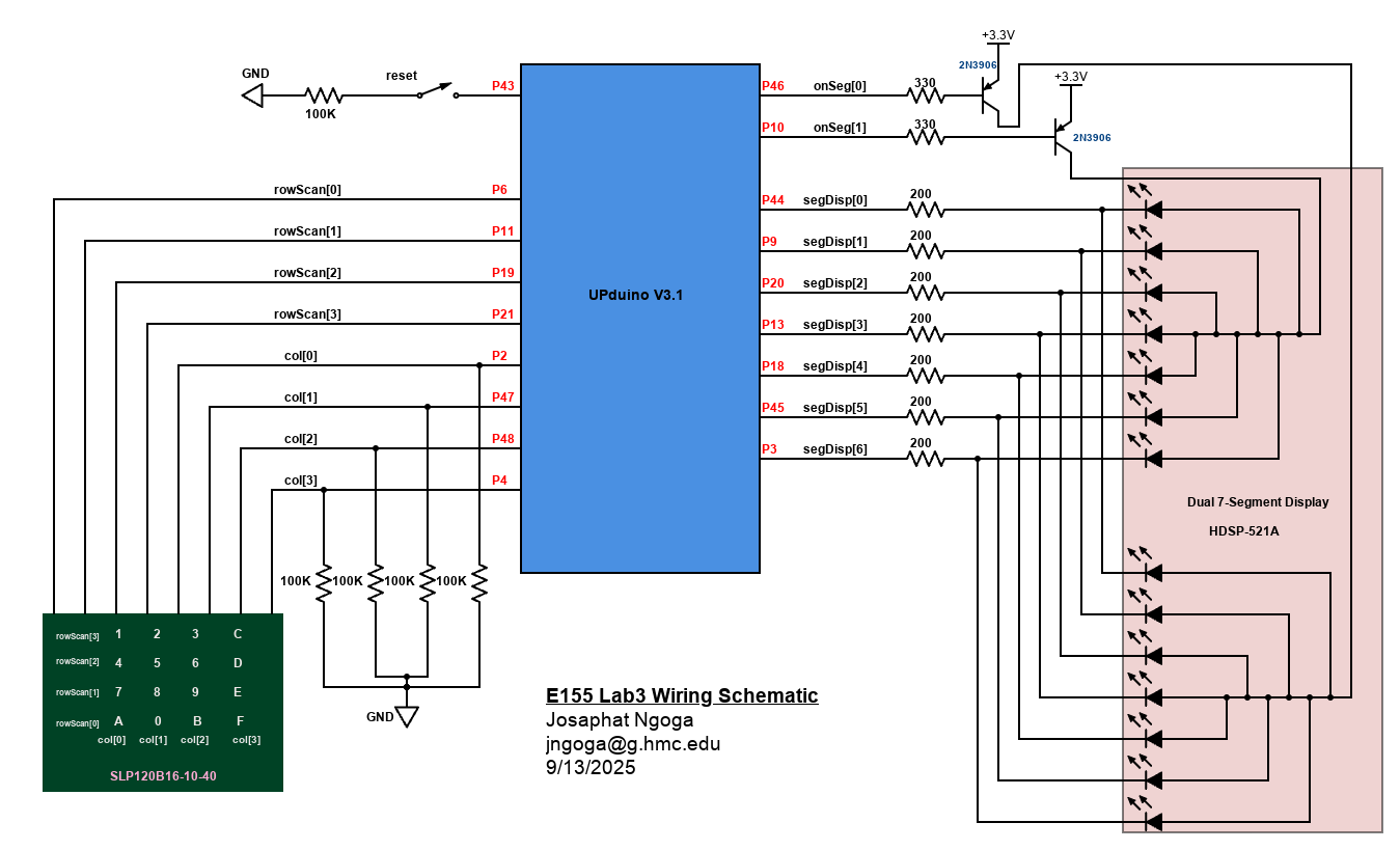 After running the simulation ensuring modules work as expected, the full setup was installed on a breadboard to read the 4x4 matrix keypad and control the dual 7-segment display using the following schematic: