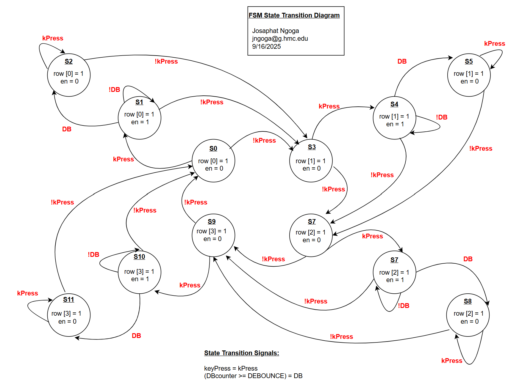The FSM logic starts in 4 scan states: S0, S3, S6, or S9 each corresponding to one of the 4 rows. They allow the FSM to scan around by powering an individual row. The FSM maintains this cycle over and over until the system registers a key input. Once a key press is detected, the FSM jumps into the candidate states: S1, S4, S7, or S10 where the respective row of the keypress is held HIGH. Sampling occurs in these states where the FSM waits and see if a key is valid. In case the key is invalid, such as due to bouncing or not held long enough, the FSM jumps back to the next scanning state, looking back at all rows. If the key is indeed valid (satisfies the one-hot logic) the FSM will stay in this state up until debouncing is complete and then jump into the hold states: S2, S5, S6, or S11 and stays there until the key is released and goes back to scanning.
