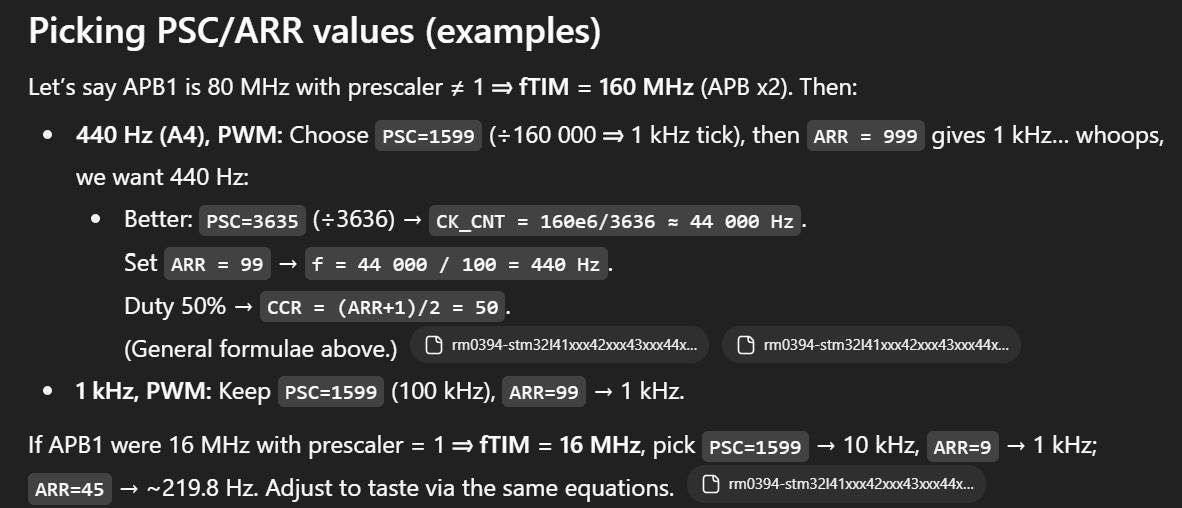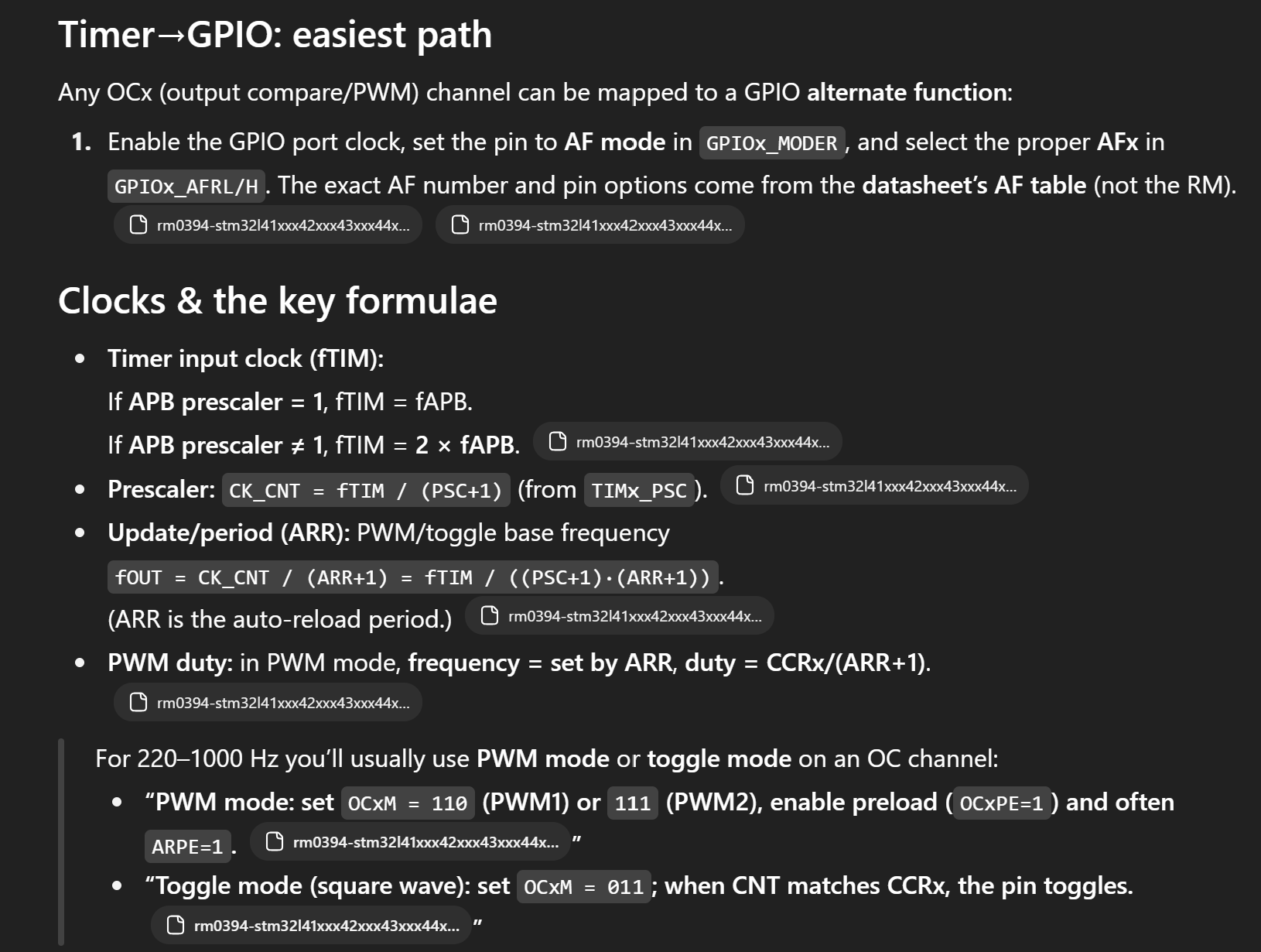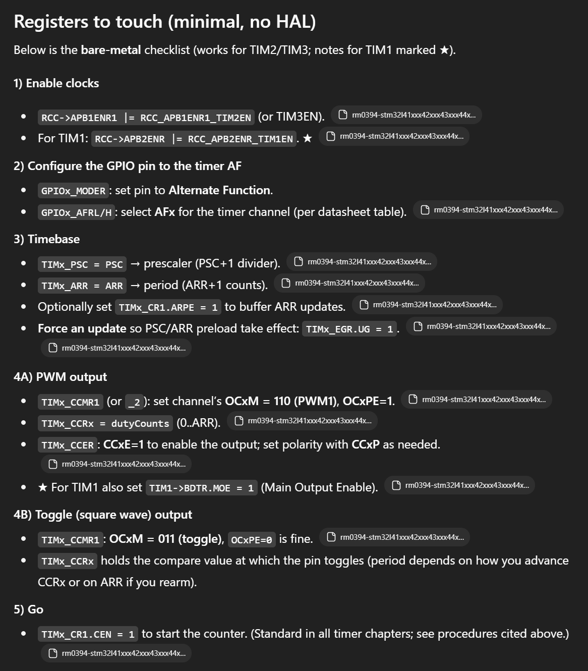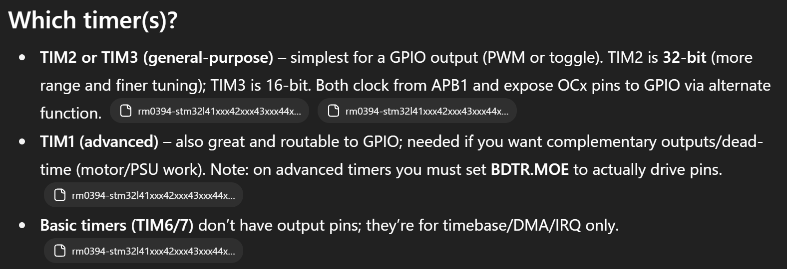 - The AI was able to recognisze the different types of registers that could be used, identified the pros and cons of using either, and also managed to predict the full course all the way from instantiating registers to implementing CCR, prescaler, and ARR functionality. However this was after I passed the STM32L4 reference manual along with the prompt. Figure 3 below shows this initial realization: