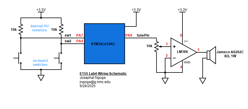 After verifying the MCU logic, the code was uploaded on the hardware for testing using Segger Embedded Studio. The setup used onboard switches connected to pins A7 and A4 of the MCU. These pins were used to switch between the two available songs. The switches were configured by activating the onboard \(10k\Omega\) pull-up resistors through the dedicated PURPDR GPIO function. The MCU toggle output through pin A7 was fed into a \(10k\Omega\) potentiometer for volume control, which sent it to the non-inverting input of the LM386 op-amp. The ouput of the op-amp (analog signal) went to the speaker to play the chosen song. All components were collected and assembled on an extended breadboard following the schematic below: