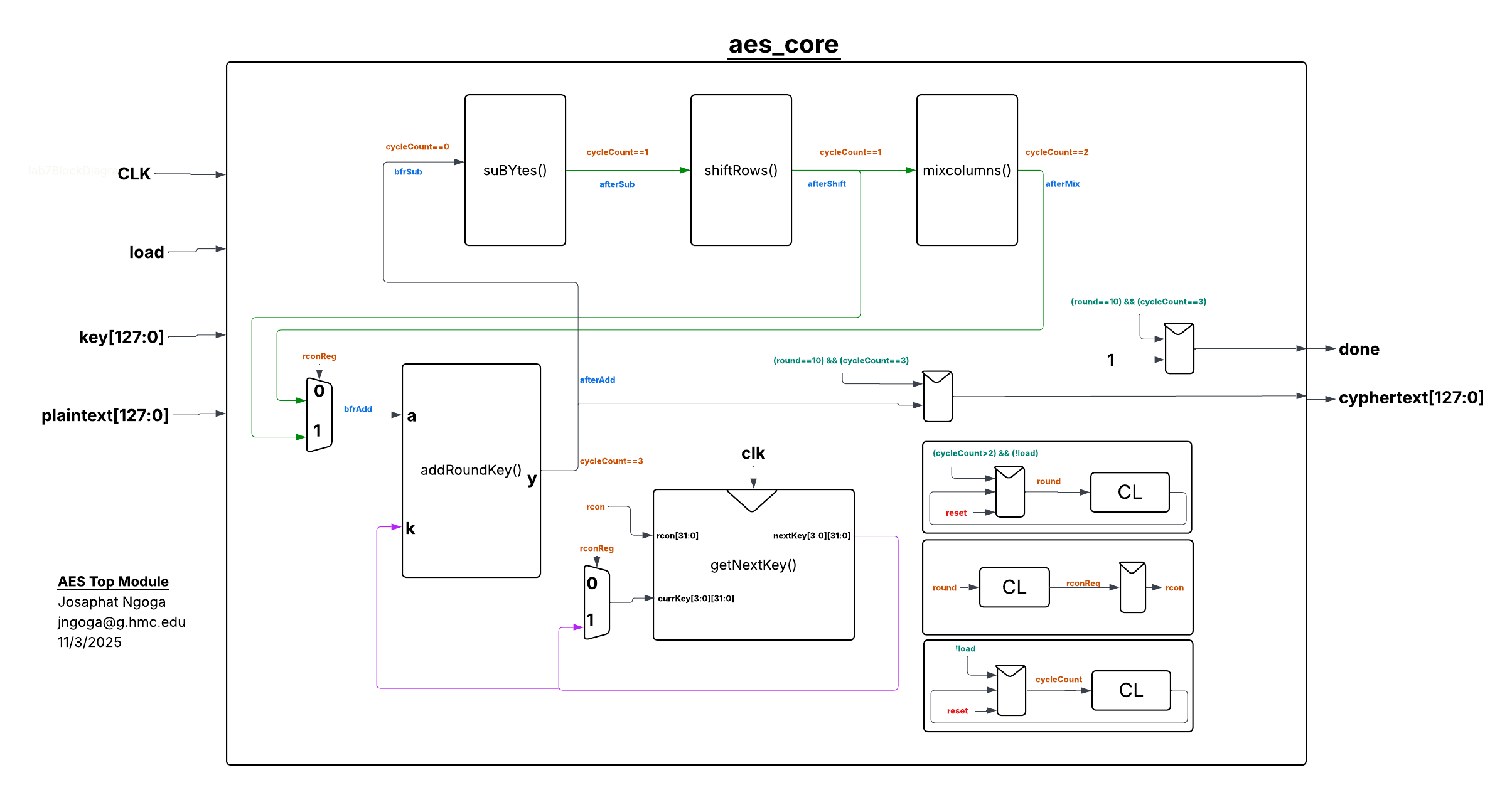 Using a synchronized sbox meant that it takes multiple cycles per round to process the data sequentially and safely propagate signals through the combinational logic. Therefore I used cycleCountto basically set when to take inputs, when to latch outputs and when to move to the next rounds. The cycle count was also to help account for the single cycle delay caused by subBytes(). Without it, the datapath would race and try to perform key operations before byte substitution stabilizes.