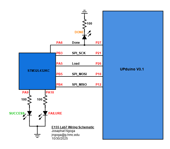 To run the setup, we implemented the aes() module that prompts both aes_core() and the aes_spi() module that executes SPI communication betweent both the MCU and the FPGA. Since data is received by the FPGA based on SCK from the FPGA, I added a synchronizer that ensures the load signal referenced by the FPGA for encryption, is latched on the rising edge of the internal clock (HSOSC/clk) instead of the SPI clock domain. This eliminated a synchronization error where encryption would be randomly true/false depending on the data latched. The connection and signals between these modules is shown in Figure 1.