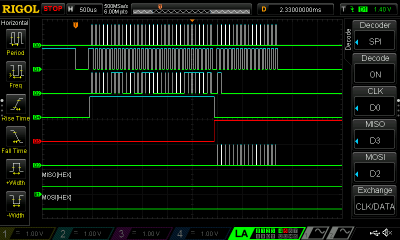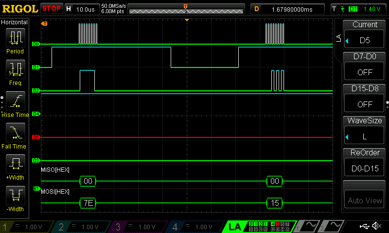 The zoomed in transaction shows that the MCU is at the stage of sending the key to the FPGA after which it will set the load signal LOW to begin encryption.