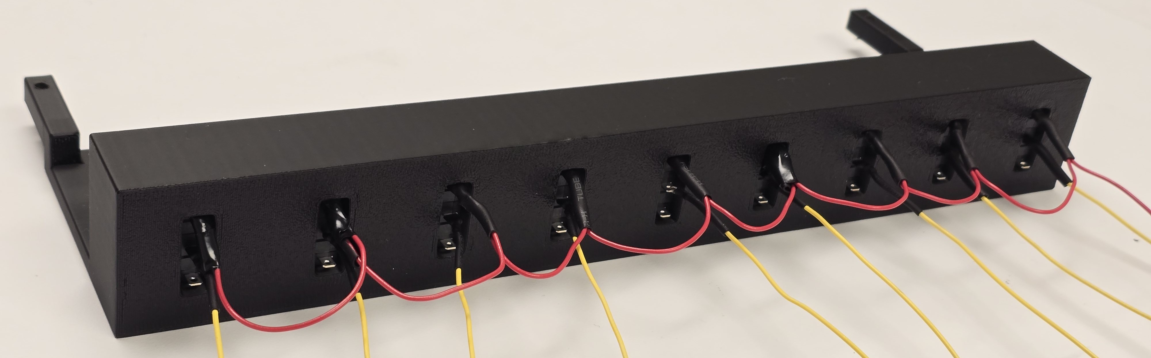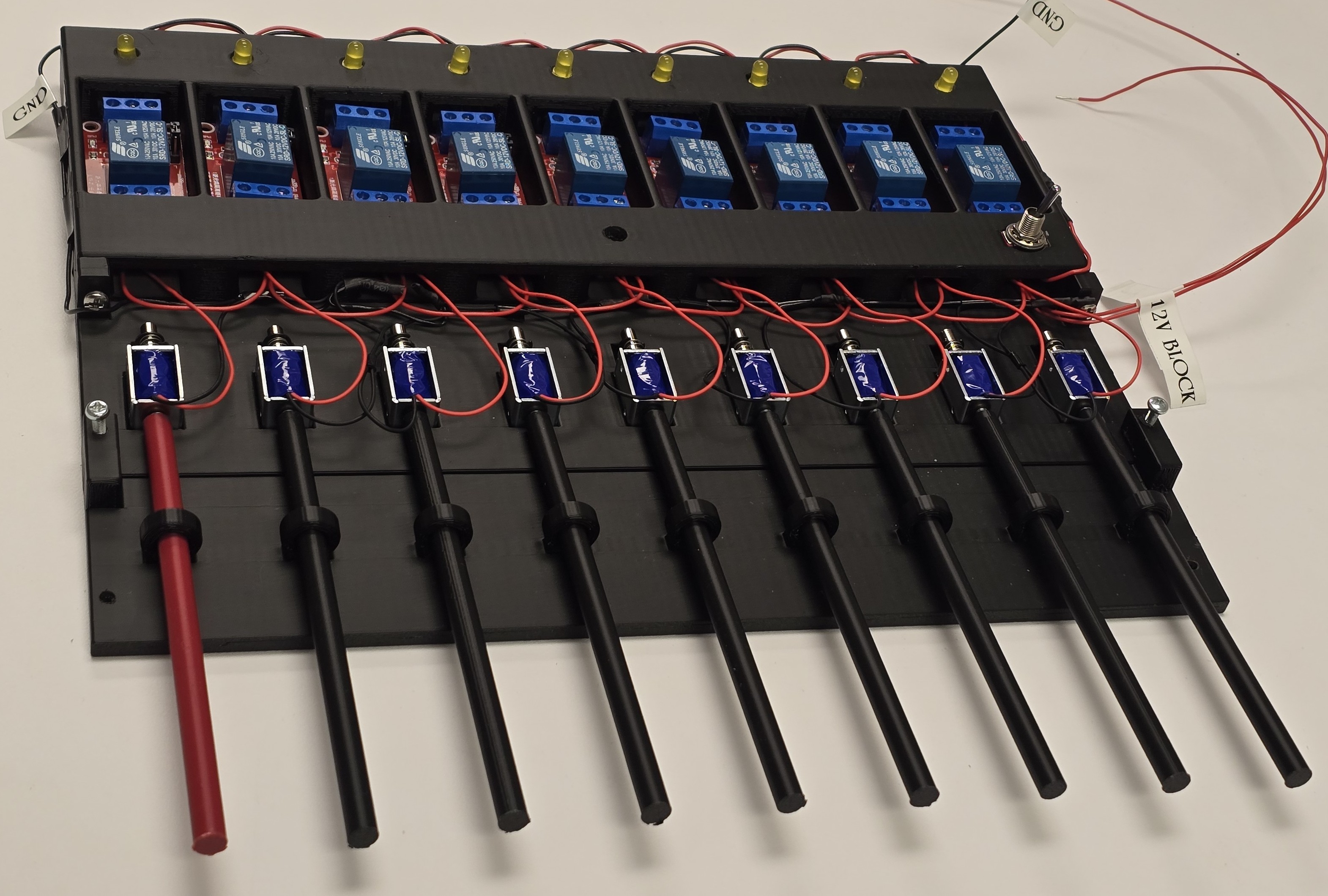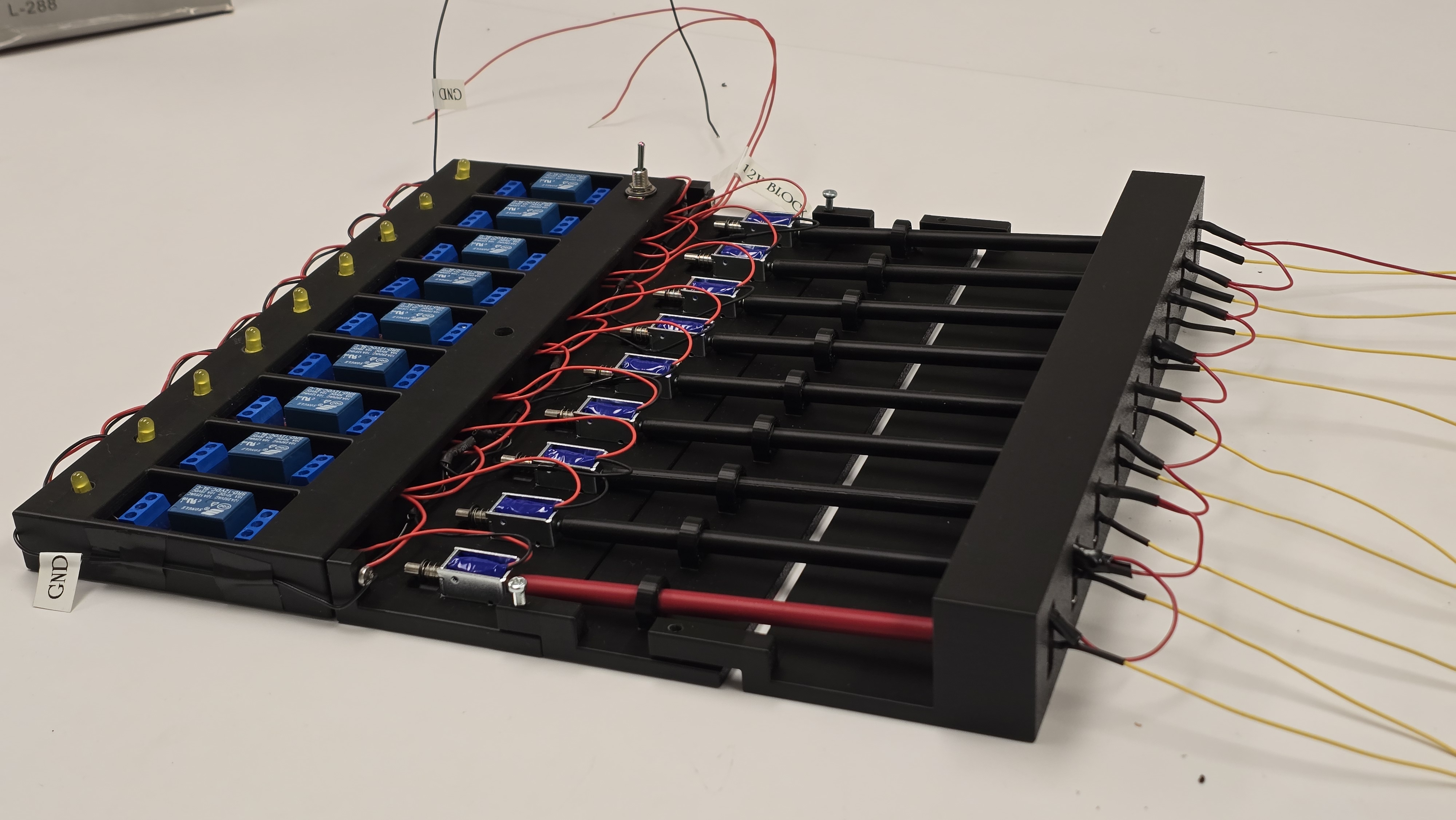 The tiny circular holes shown at the top hold debugging LED that are used to vizualize if the respective signal line is activated. That is, if the FPGA sends a logic HIGH, the LED in that opening lights up. The other huge opening in the top left holds a toggle flip switch that turns ON or OFF the whole block. The wires are daisy chained to reduce the wiring mess. This is possible because all relays are powered by the same voltage, \(12V\), and require the same ground reference. The debugging LED are the hardest to setup. We soldered \(100\Omega\) resistors to the anode legs and bent them to fit into the square openings seen in the block. The other leg of the resistor slots in the signal input terminal of the relay while the LED cathode leg is locked inside the the relay ground terminal. The fully assembled relay block is shown in Figure 2 below: