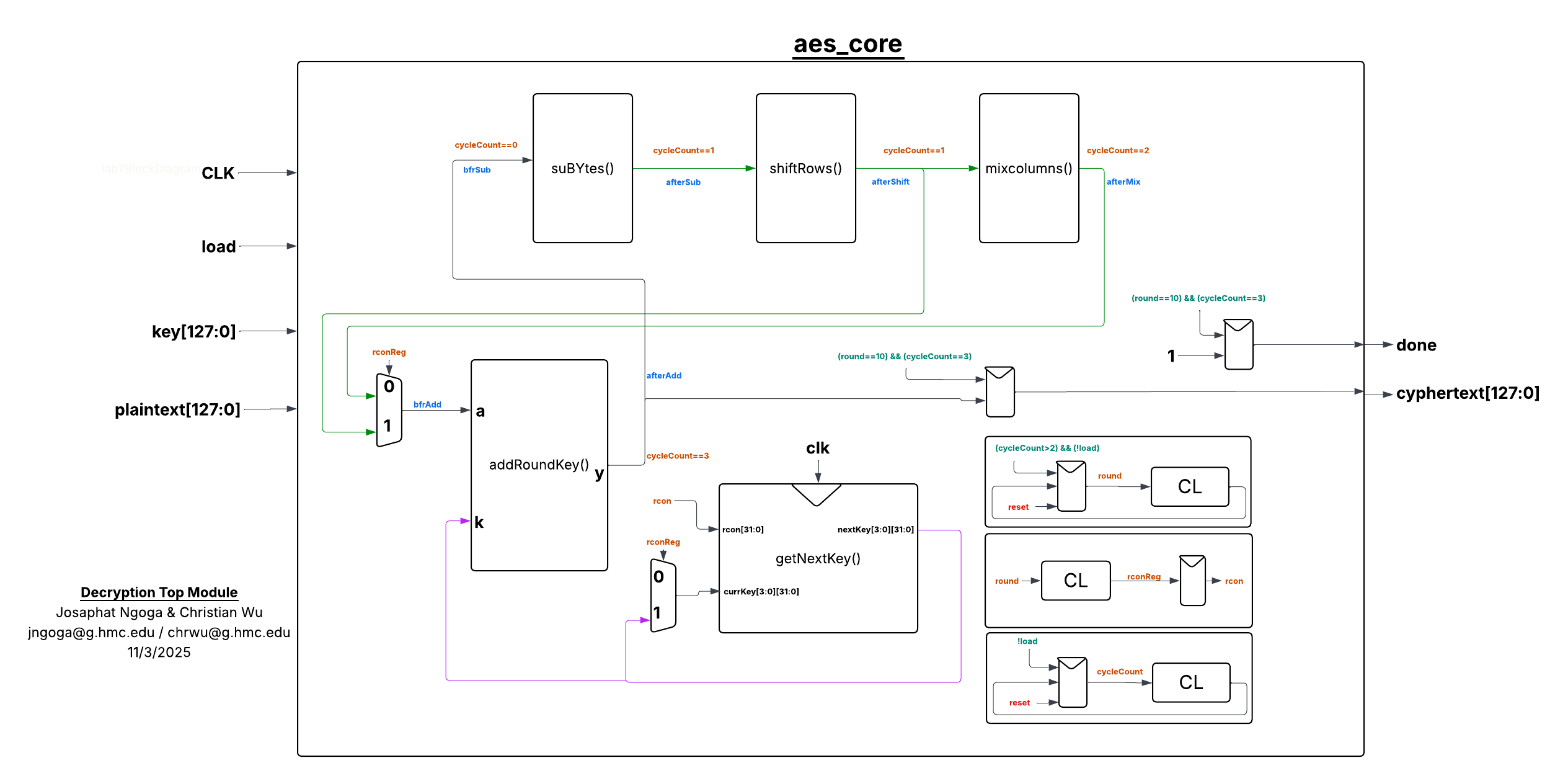 Using a synchronized sbox meant that it takes multiple cycles per round to process the data sequentially and safely propagate signals through the combinational logic. Therefore we used cycleCountto basically set when to take inputs, when to latch outputs and when to move to the next rounds. The cycle count was also to help account for the single cycle delay caused by subBytes(). Without it, the datapath would race and try to perform key operations before byte substitution stabilizes.