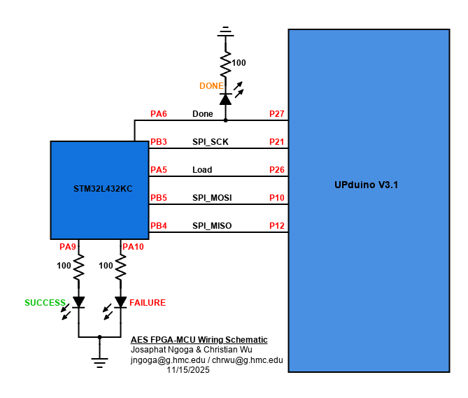 For debugging: MCU had code that tested using standard NIST vectors. Once the cyphertext is received, it compared it to the expected cyphertext through a difference operation. If all operations yield zero, a green LED through PA9 would light up, otherwise a red LED at P10 lights up indicating that encryption didn’t work properly. This process was always triggered using the MCU reset that restarted the transactions.